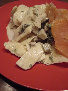 Ook maakte ik voor het eerst een recept met knolselderij. Ik weet alleen dat knolselderij door de erwtensoep wordt gedaan, maar voor de rest heb ik geen idee van dit product. We kregen de knolselderij in ons eerste biologische groentepakket (bevalt heel goed!) en dus kwam ik hiermee in aanraking. Dit recept was afkomstig uit het boek 'JAMIE, de basis van het koken' van Jamie Oliver.